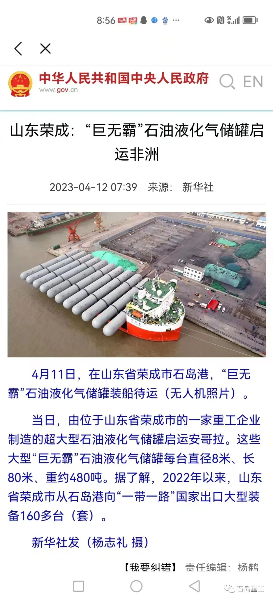 石島重工安哥拉LPG項目裝船發貨啟運非洲新聞受到多家主流媒體報道
